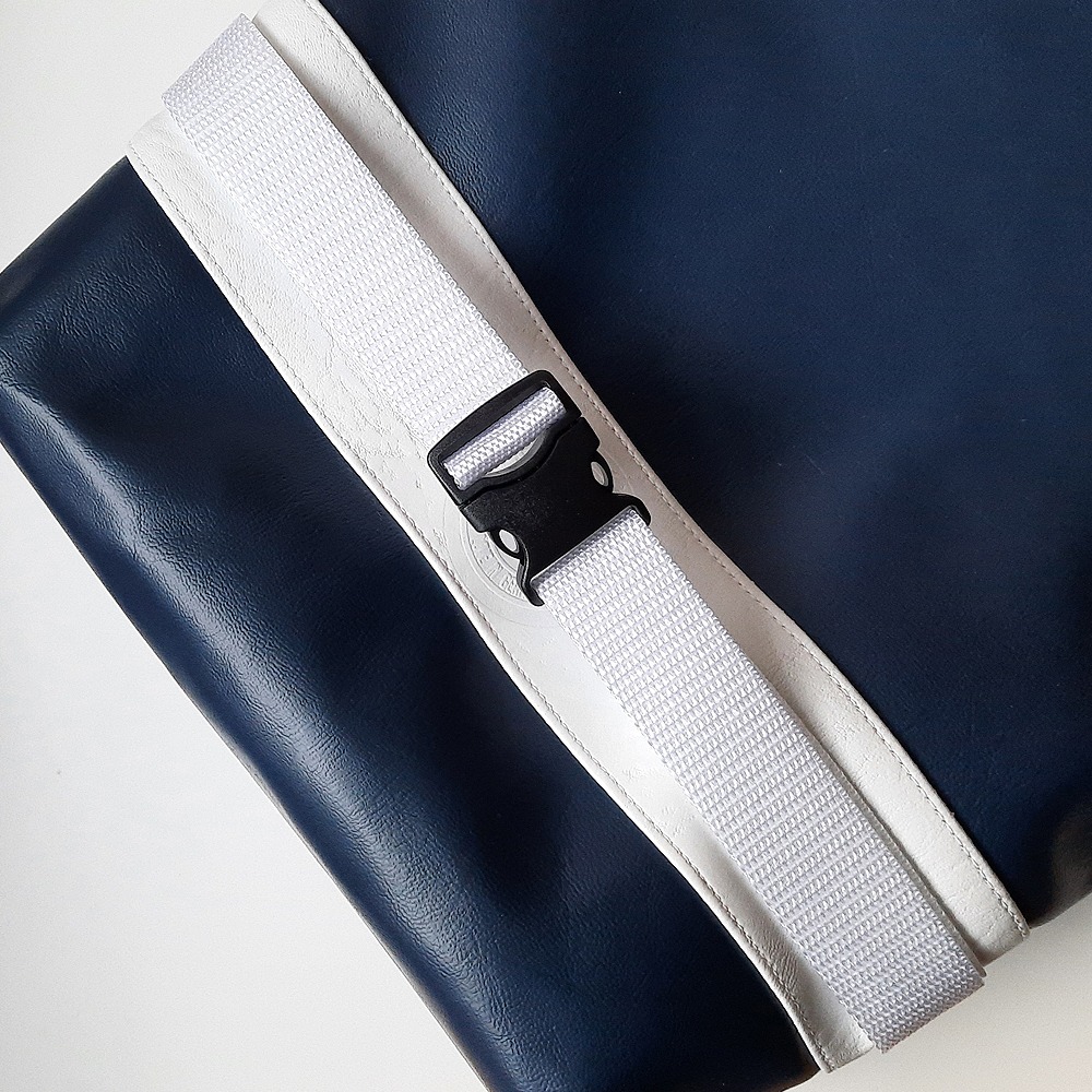 – gefertigt aus dunkelblauem und weißem Kunstleder