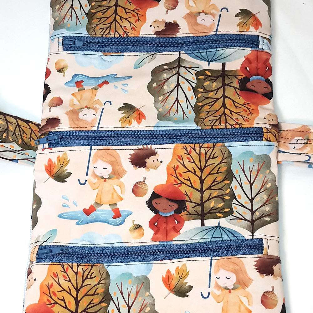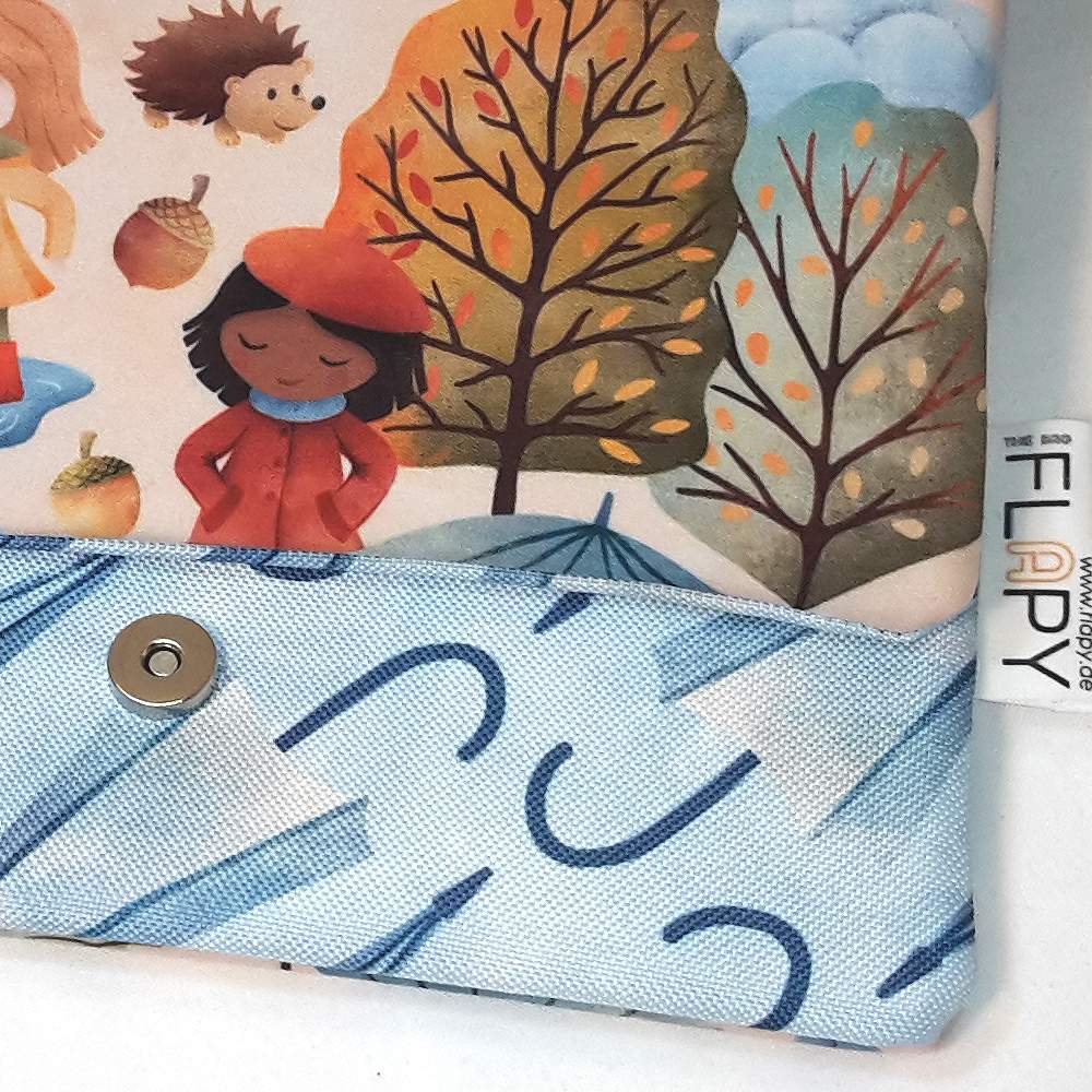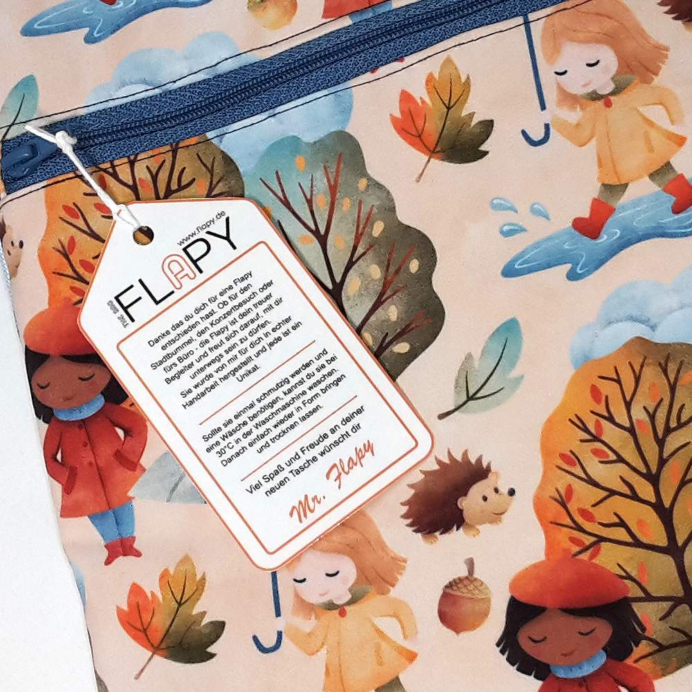 Diese Umhängetasche Flapy zeigt als Motiv süße Mädchen im Herbst mit Regenschirm, Eicheln und Igeln. Die Oberfläche aus Softshell macht die Tasche für den Herbst wasserabweisend und somit wetterunempfindlich. Ob als Geschenk oder zum selber tragen – mit dieser Schultertasche in tollem Design sind alle wichtigen Utensilien wie Portemonait, Schlüssel, Handy oder Regenschirm sicher, übersichtlich und schnell griffbereit verstaut. Sie ist besonders geeignet für den Einkauf, Stadtbummel, den Konzertbesuch oder den täglichen Gebrauch im Büro.