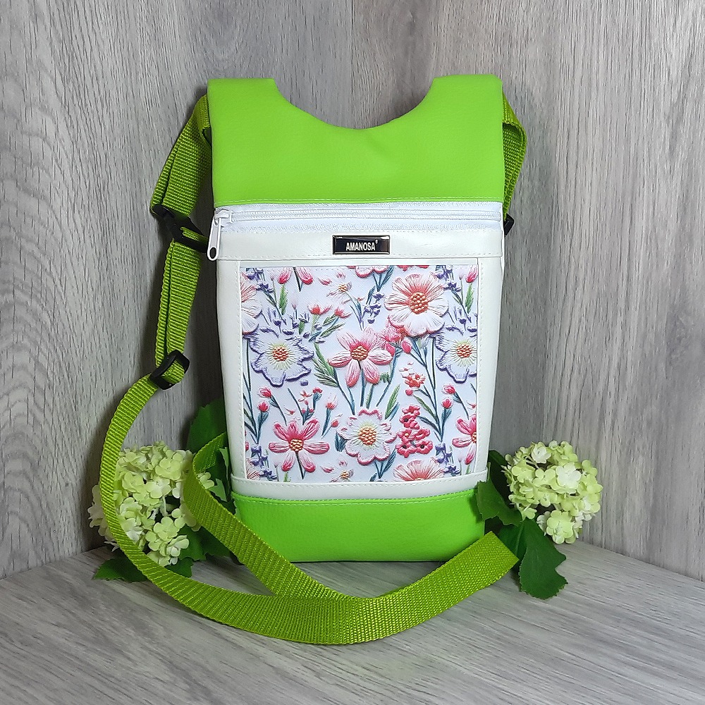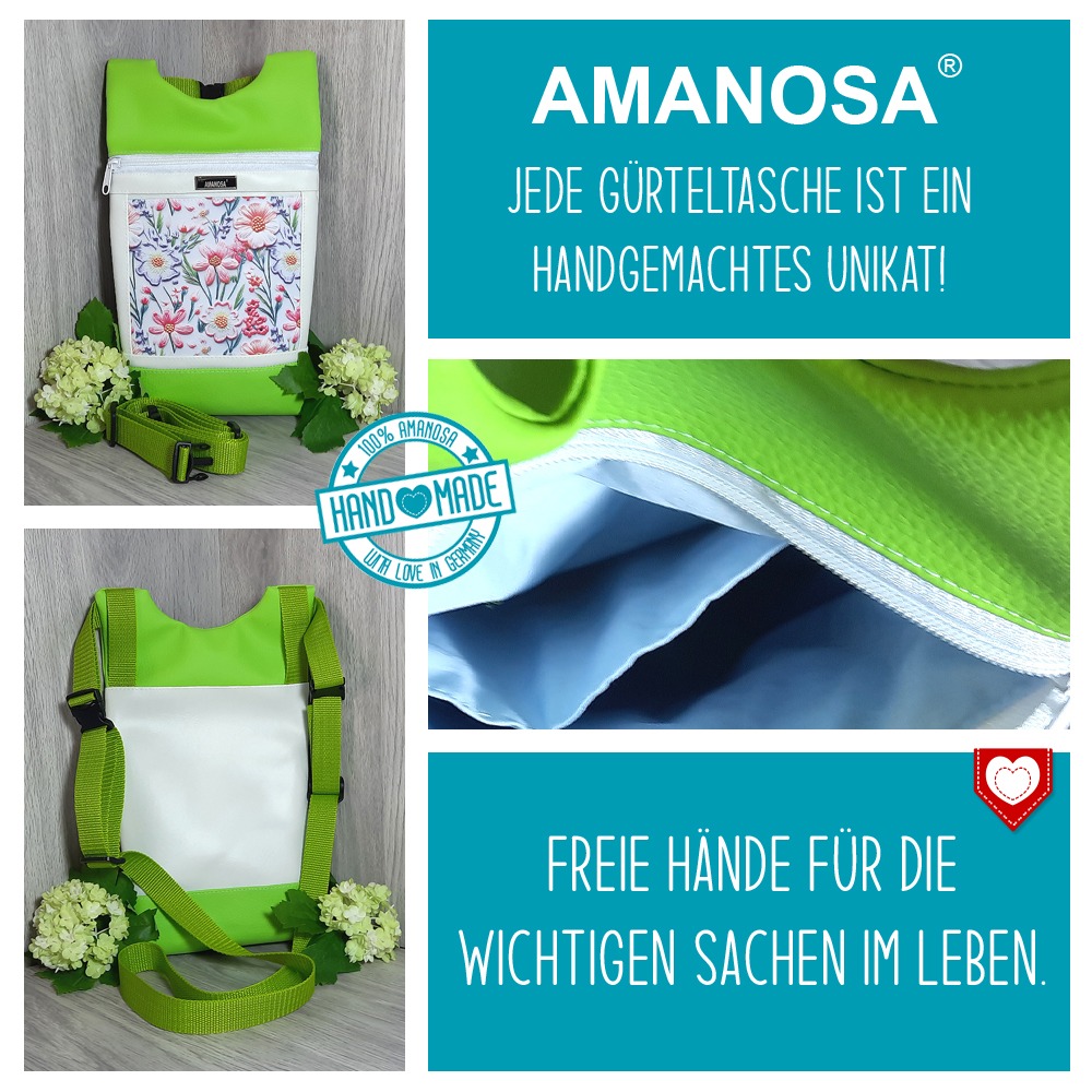 Diese Gürteltasche wurde mit Liebe zum Detail handgefertigt und trägt das unverkennbare AMANOSA-Label, das für Qualität und Handwerkskunst steht. Das Blumenmotiv, das auf der Vorderseite der Tasche prangt, verleiht ihr einen Hauch von Frische und Eleganz, während das maigrüne und weiße Farbschema für ein harmonisches Gesamtbild sorgt.