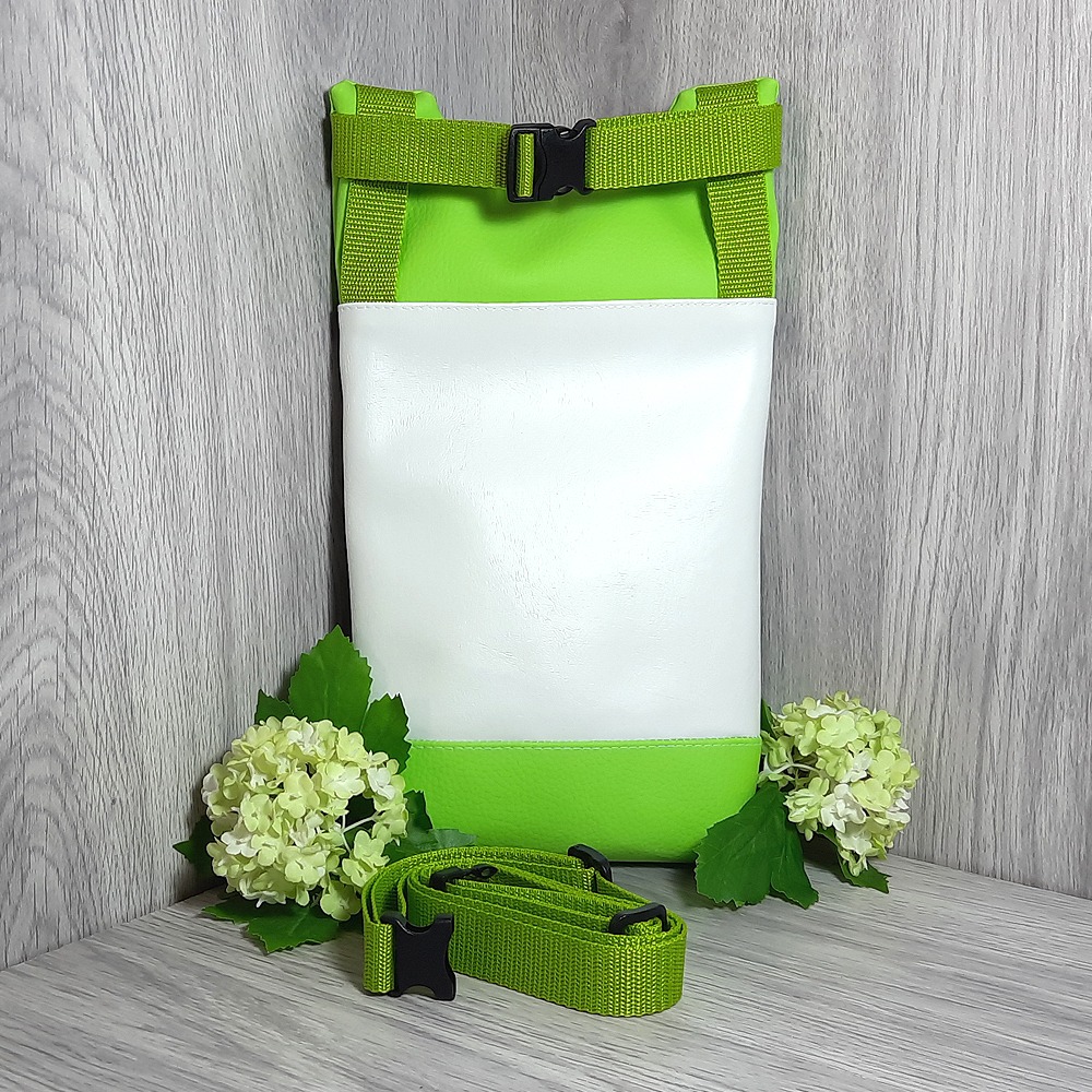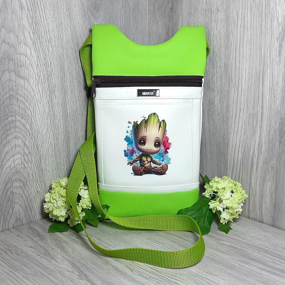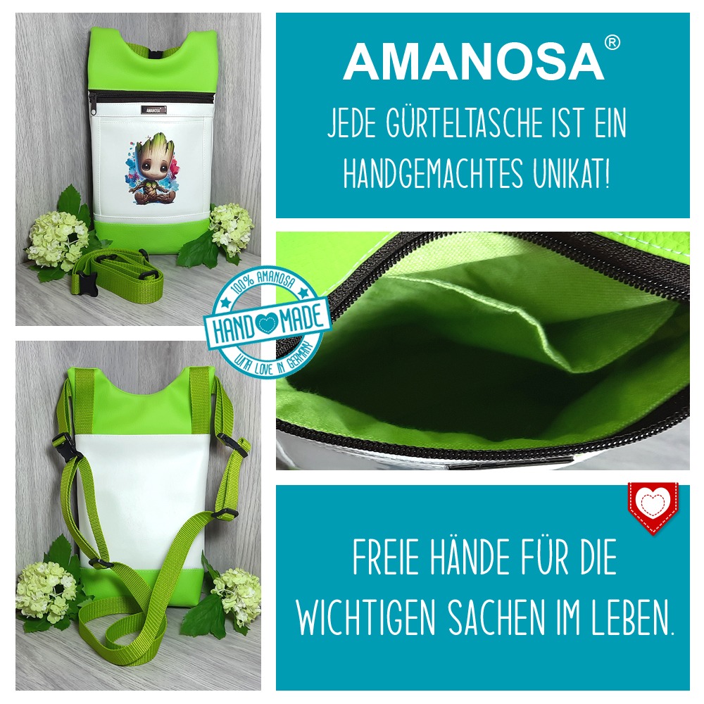 Entdecken Sie die zauberhafte Welt der Natur mit unserer einzigartigen handgemachten Gürteltasche mit dem Motiv „Elfe Junge Baum“ aus Kunstleder in Grün und Weiß von AMANOSA.