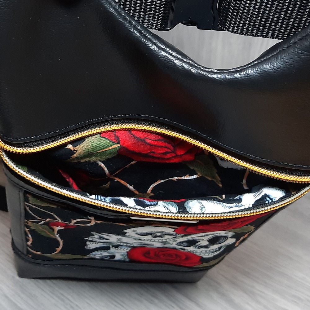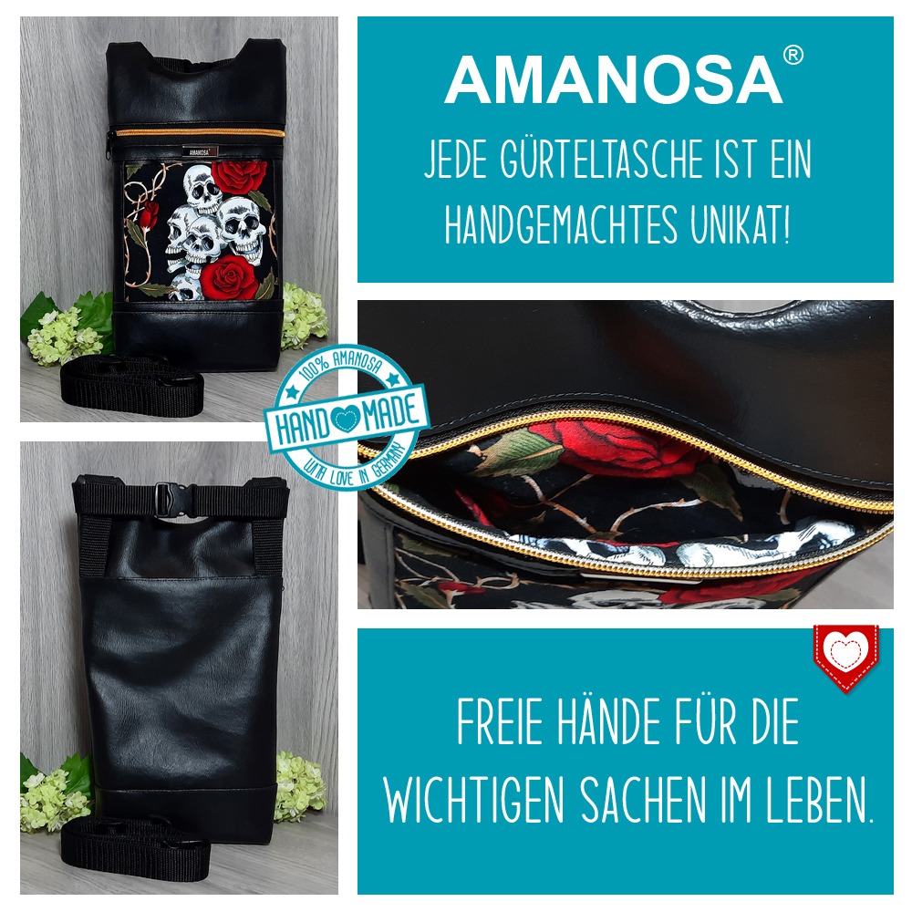 Entdecken Sie unsere exklusive handgemachte Gürteltasche von AMANOSA: ein einzigartiges Accessoire mit faszinierendem Motiv aus Totenköpfen und Rosen, gefertigt aus hochwertigem Kunstleder in elegantem Schwarz.