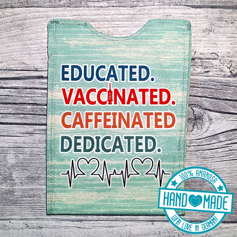 Die Impfpasshülle Impfausweistasche mit dem Motiv Educated ist in Handarbeit aus 100% Baumwolle genäht und damit bei bis zu 40 °C waschbar. Die Hülle hat die Abmessungen H 15cm und B 12 cm und ist damit geeignet für Impfausweise mit den Abmessungen bis 13 x 9 cm. Mit dieser Impfausweis Tasche hast du den Impfausweis immer griffbereit parat und sie schützt vor Schmutz, Zerknicken und Knittern. Und dazu sieht sie noch echt toll aus!