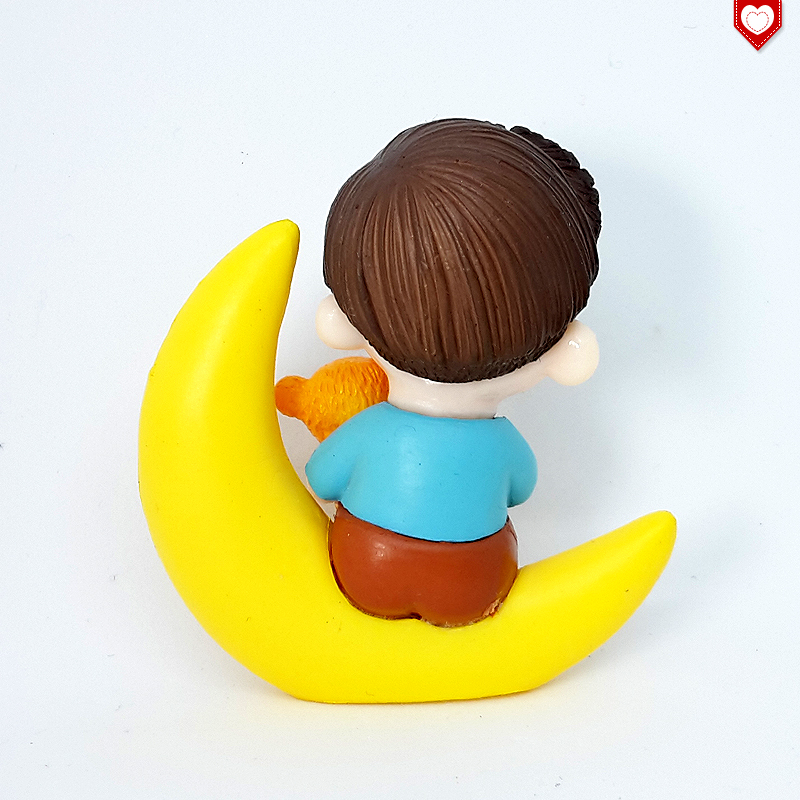 Diese kleine Figur zeigt einen kleinen Jungen der mit seinem Teddy auf einem Mond sitzt.