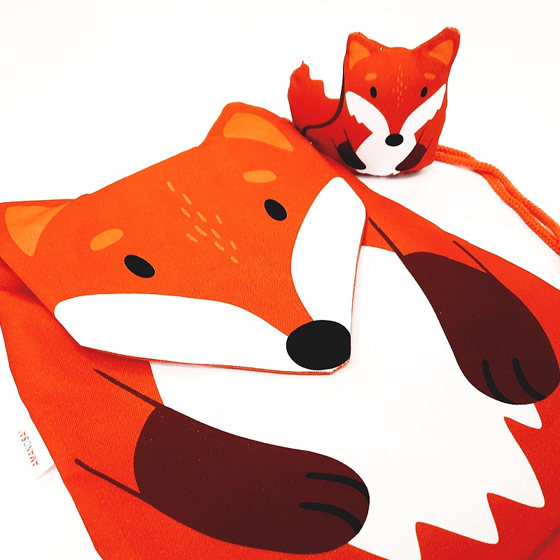 Dieses Kinderrucksack Set mit dem Motiv Fuchs besteht aus einem Rucksack, einem Brustbeutel, einem Stiftemäppchen sowie einem Stofftier in Form eines kleinen Fuchses.
