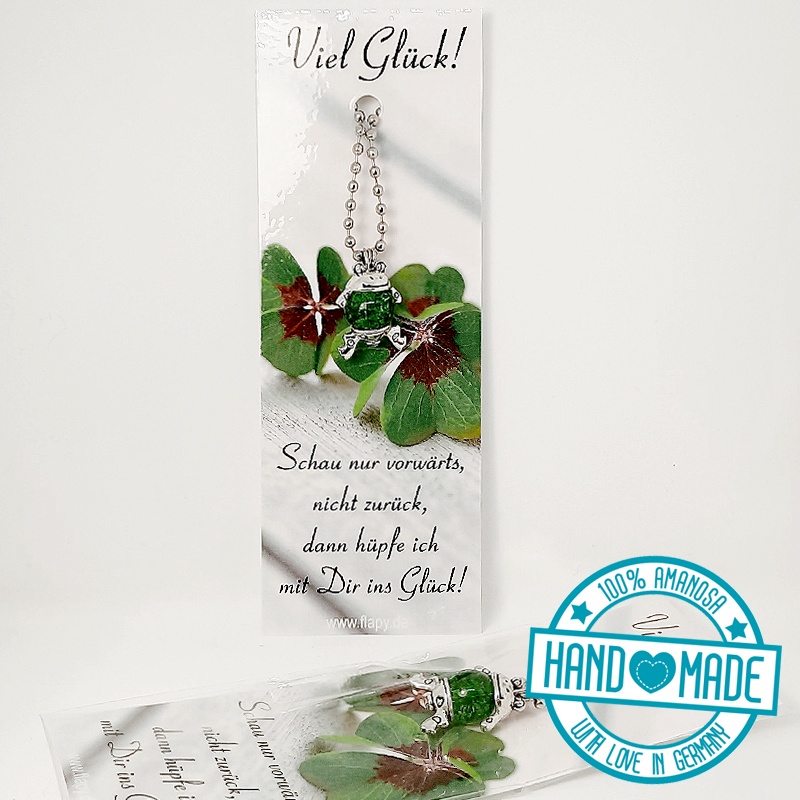 Dieser Schlüsselanhänger ist ein Glücksbringer. Der kleine Frosch soll dem Beschenkten oder auch dir selbst viel Glück bringen. Die grüne Perle in der Mitte ist eine Crackle Glasperle. Trage den Anhänger Glück Frosch am Schlüsselbund oder an der Tasche, und das Glück wird immer auf deiner Seite sein.