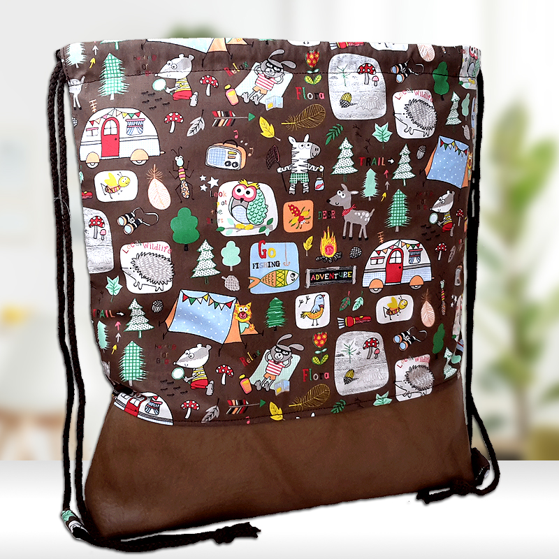 Der Stoffbeutel zeigt als Motiv verschiedene Motive zum Thema „Abenteuer“. Der braune Teil besteht aus Kunstleder und ist somit abwischbar. Die braune Baumwollkordel ist schön weich und trägt sich angenehm auf der Haut.