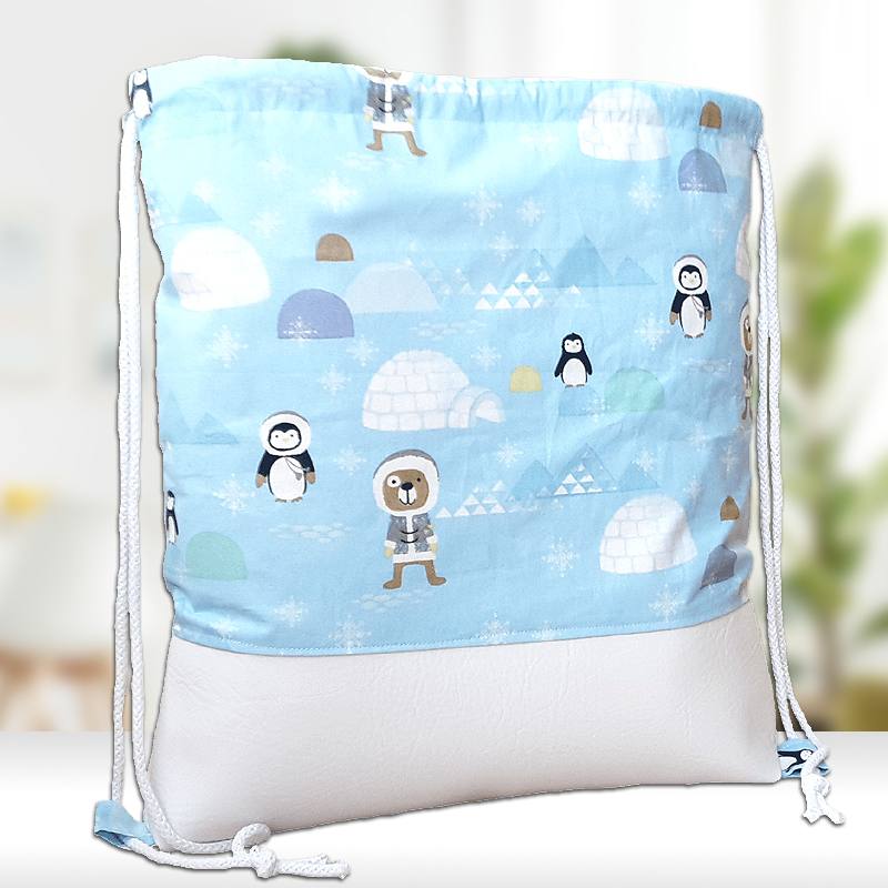 Der Stoffbeutel zeigt als Motiv Bär und Pinguin am Nordpol, der weiße Teil besteht aus Kunstleder und ist somit abwischbar. Die weiße Baumwollkordel ist schön weich und trägt sich angenehm auf der Haut.